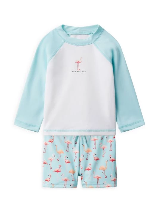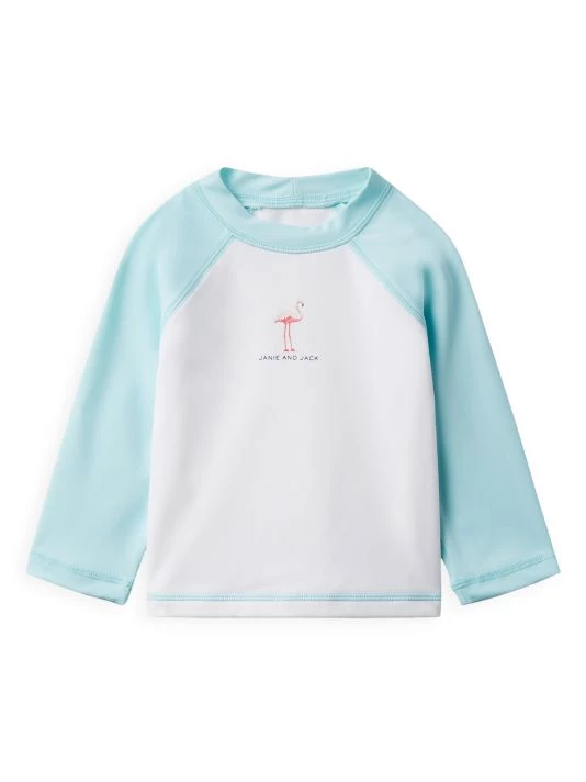 With colorblocked raglan sleeves, this long-sleeve rashguard T-shirt in a UPF 50+ fabric features a screen-printed flamingo graphic on the front.