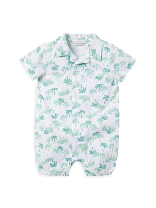 This short-sleeve bubble romper resembles a Hawaiian-inspired shirt with a spread collar, a patch pocket on the chest, and a palm tree print.