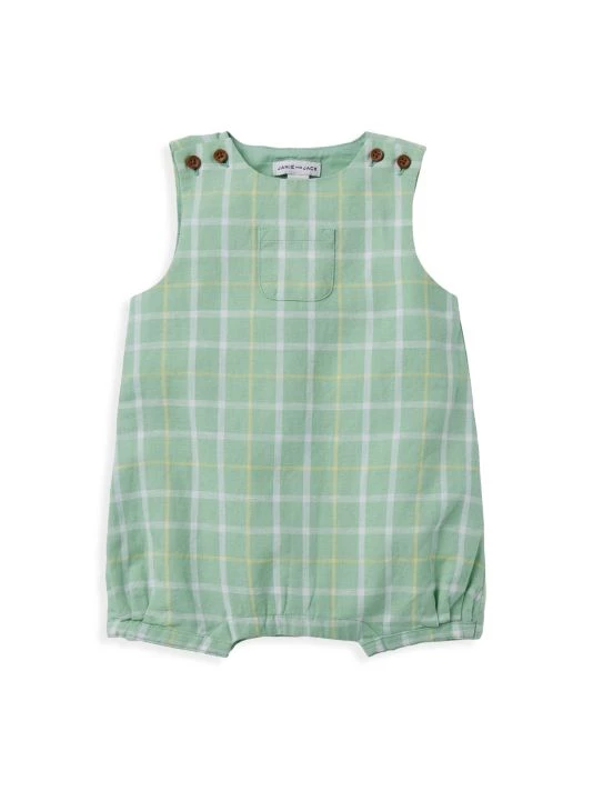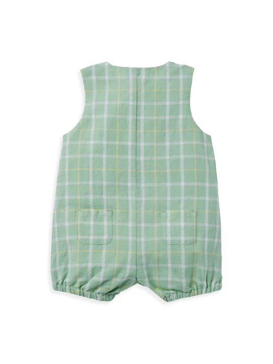 This linen sleeveless bubble romper in a plaid pattern features wooden buttons and a patch pocket on the chest.