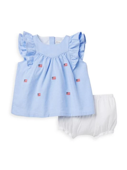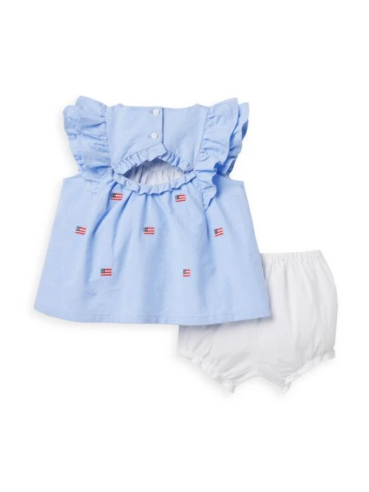 A two-piece americana style set featuring all-over embroidered flags and a ruffle trim top with bloomers. 100% cotton. Machine wash. Imported.
