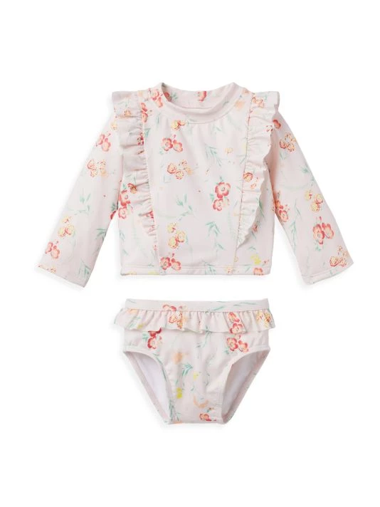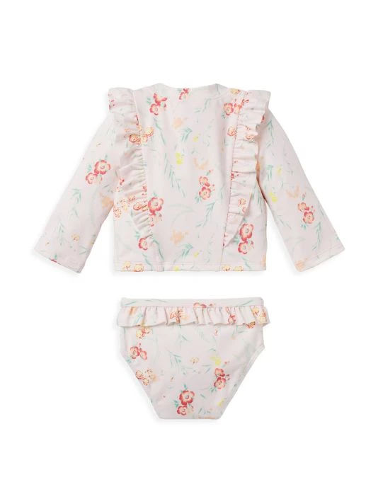 This two-piece swim set in a UPF 50+ sun protection rashguard fabric includes a long-sleeve floral-print top with ruffle details and matching bottoms. 74% polyester/26% spandex. Lining: 100% polyester. Hand wash. Imported.
