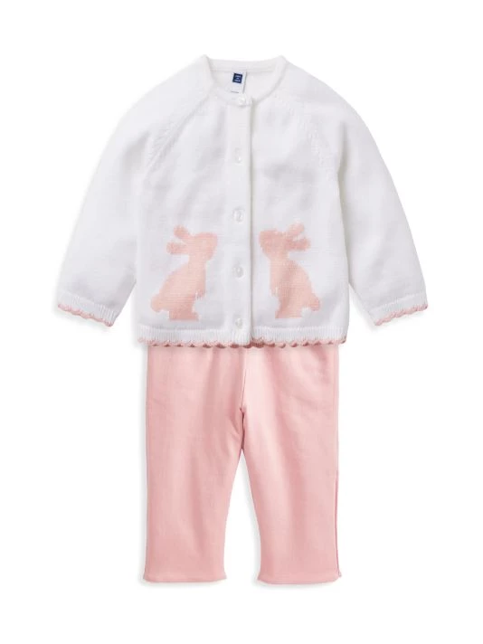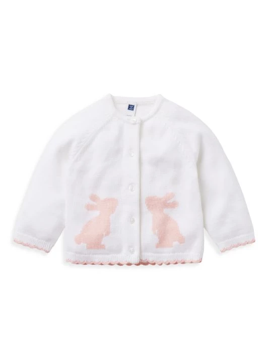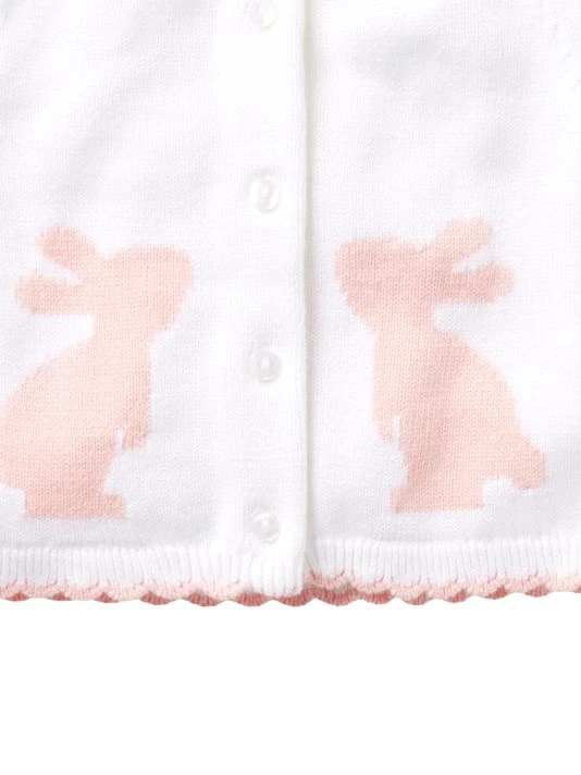 This knit cardigan features bunny rabbit intarsia and scallop trim details.
