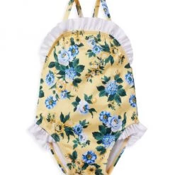 This one-piece swimsuit by Janie and Jack is adorned with an intricate floral motif. Finished with ruffled trim at the neckline and hips, this style’s back features a crossed-strap design.