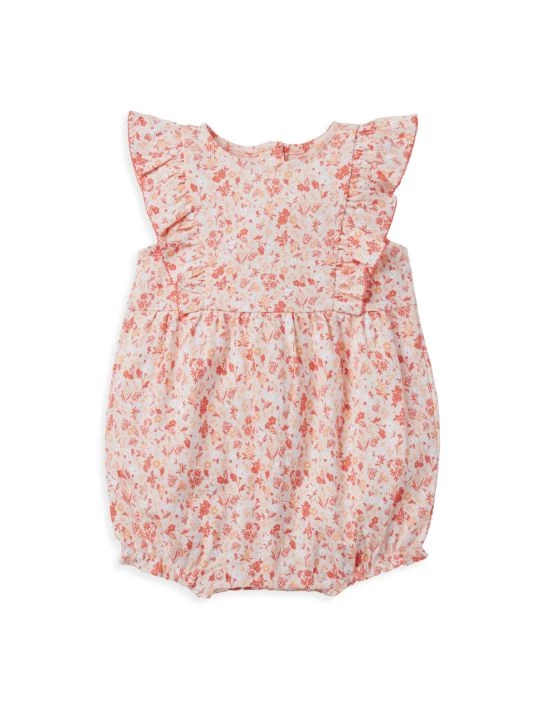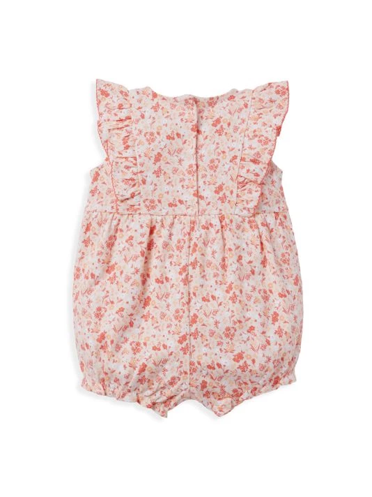 This bubble-style romper is adorned with a foliage-inspired floral print that features ruffle details at the shoulders.