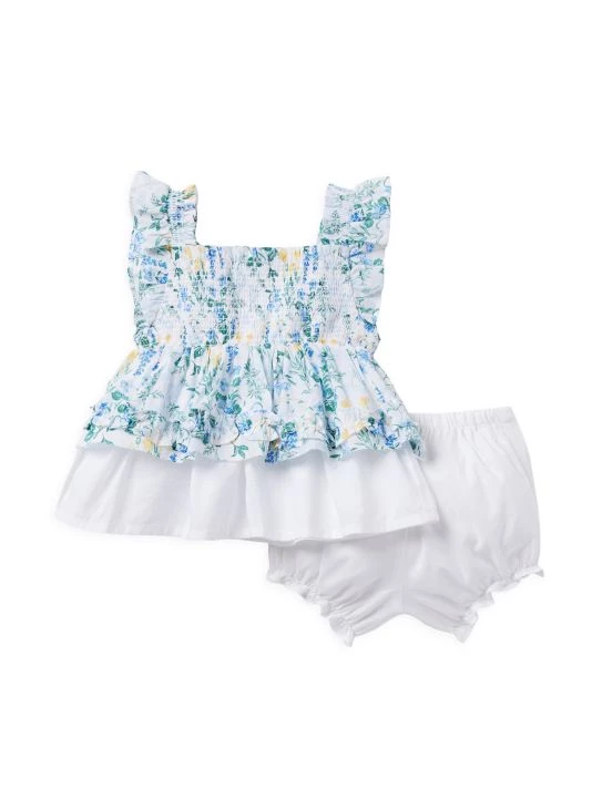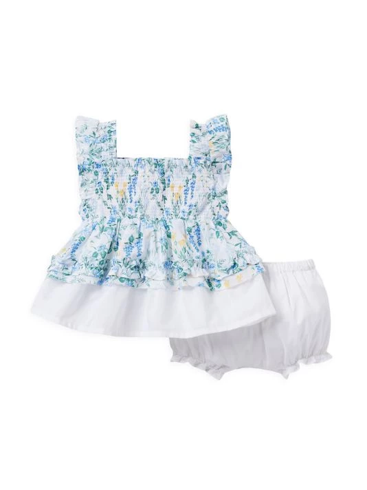 Crafted of cotton batiste, this set by Janie and Jack includes a smocked floral top and crisp bloomers. Both pieces are finished with ruffled trim lending a delicate touch to the set. 100% cotton. Machine wash. Imported.