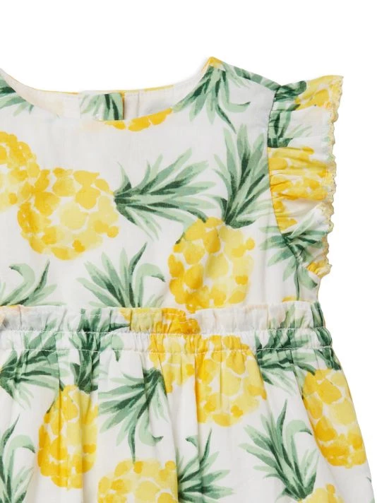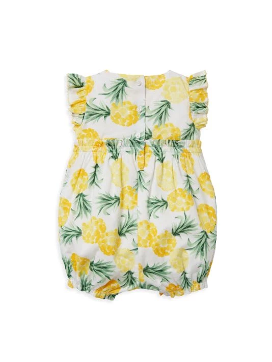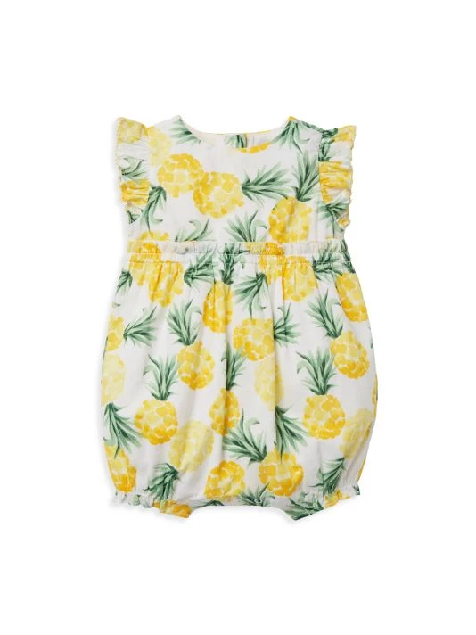 Adorned with a pineapple print, this bubble romper features ruffle trim flutter sleeves.