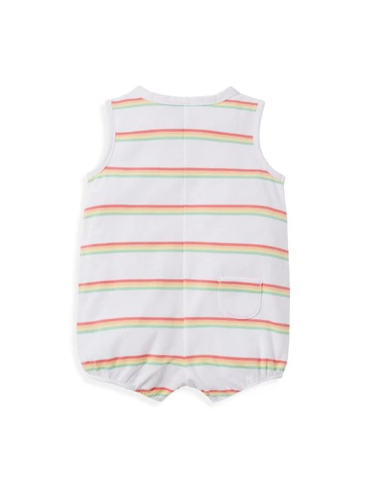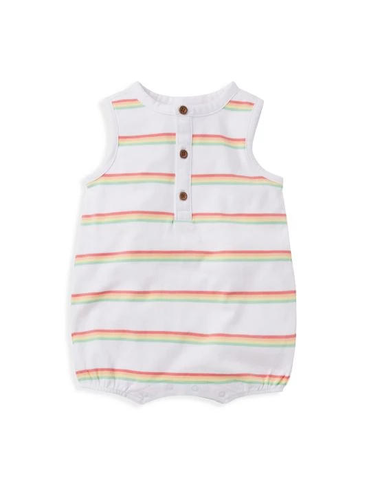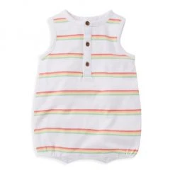 This sleeveless bubble romper in a henley style features a multicolor striped pattern.