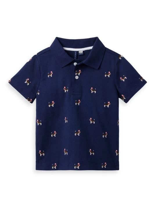 This jersey polo features a puppy print with a 4th of July-inspired theme.