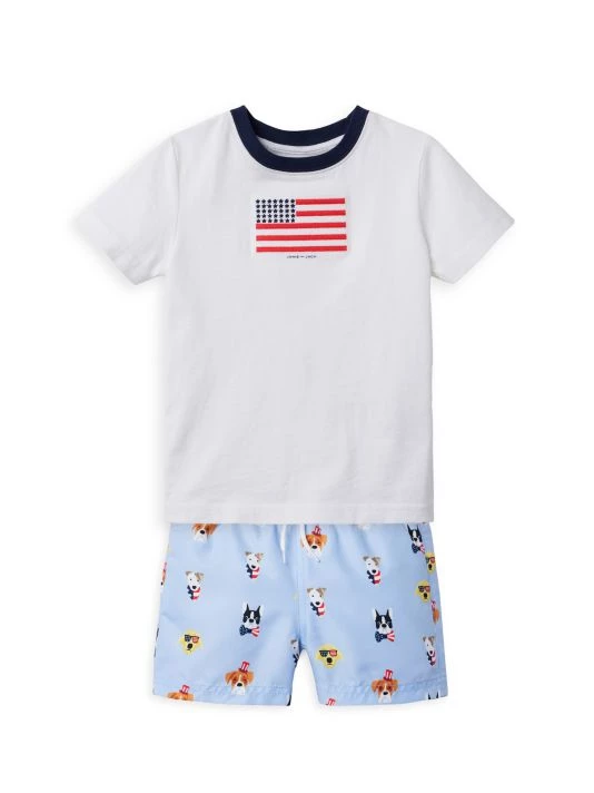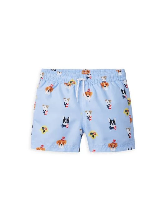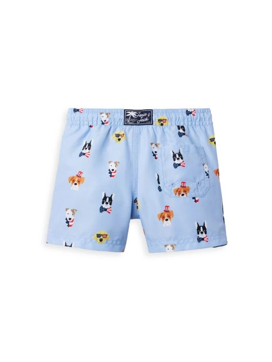 These swim trunks in a UPF 50+ sun protection fabric feature a patriotic-inspired dog print.
