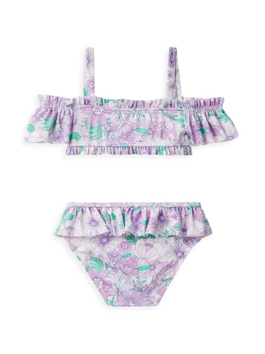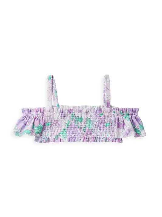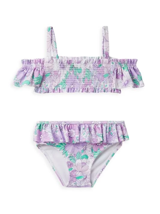 Crafted of UPF 50+ sun protection fabrication, this stylish two-piece set flaunts a romantic floral print paired with smocked detailing and ruffle trim at the top and bottom. 82% nylon/18% spandex. Hand wash. Imported.
