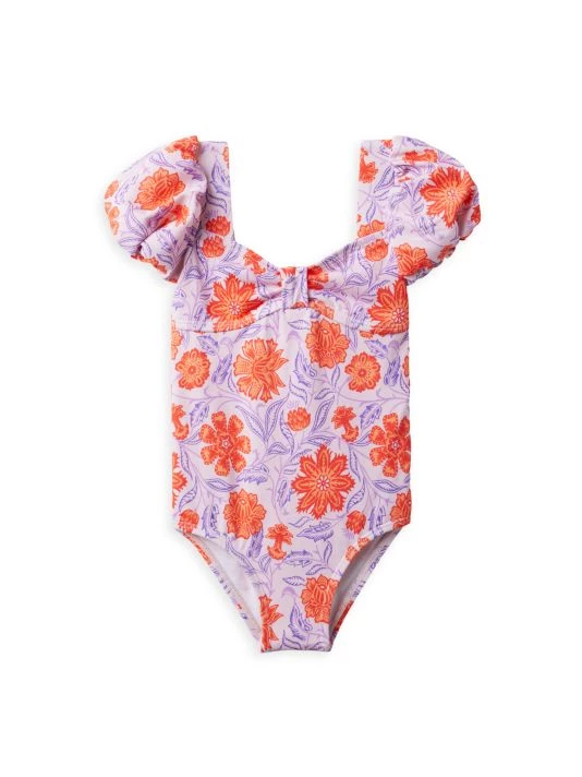 The puff sleeve one-piece swimsuit in a UPF 50+ sun protection fabric is adorned with a paisley-inspired floral print.