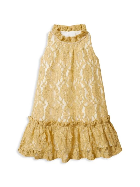 A shimmering lace dress that will match her heart of gold. With ruffles just for the frill of it. Fully lined. Button back. Bloomer included.