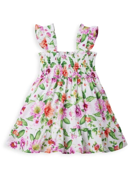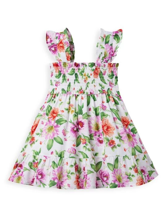 This A-line dress in a vibrant floral print is detailed with ruffled straps and a stretch-smocked bodice.