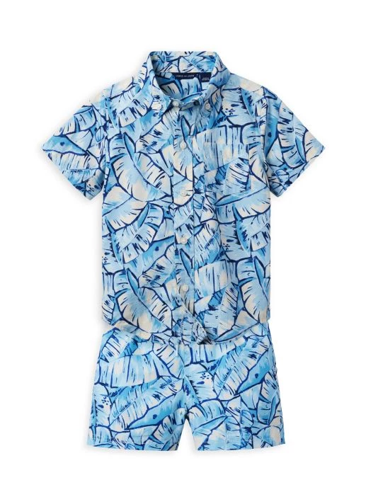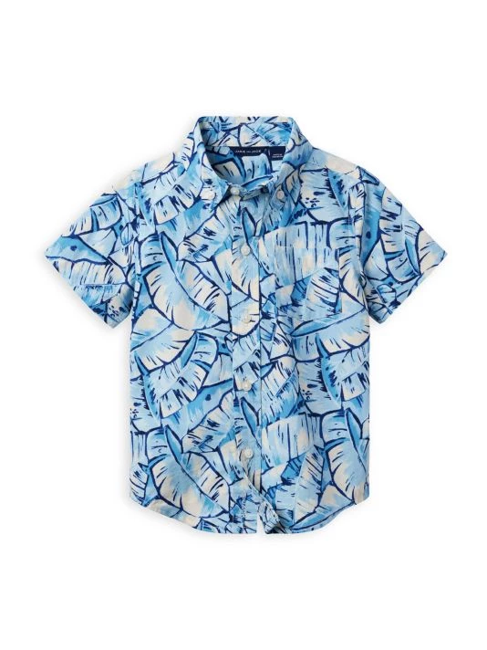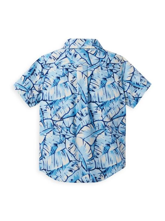 Crafted of cotton poplin, this shirt from Janie and Jack features a button-down spread collar, a chest patch pocket, and an enlarged palm-leaf print. The intricate fauna motif gives it a lively tropical vibe.