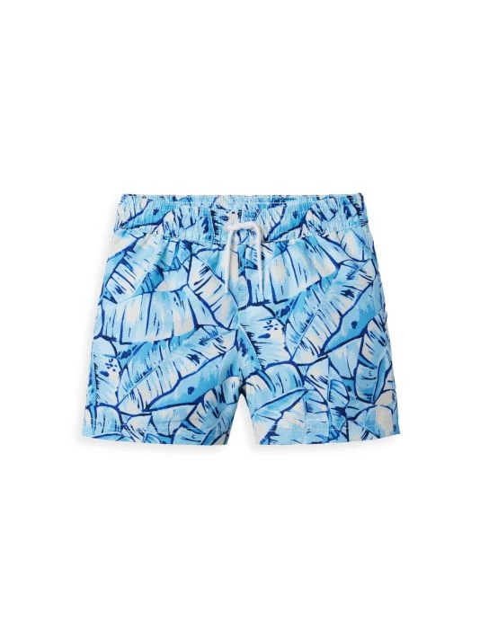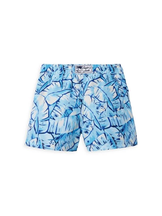 These Janie and Jack’s swim shorts are crafted of polyester and adorned with an enlarged palm-leaf print. The style is finished with a drawstring waistband and back grip-tape patch pocket.