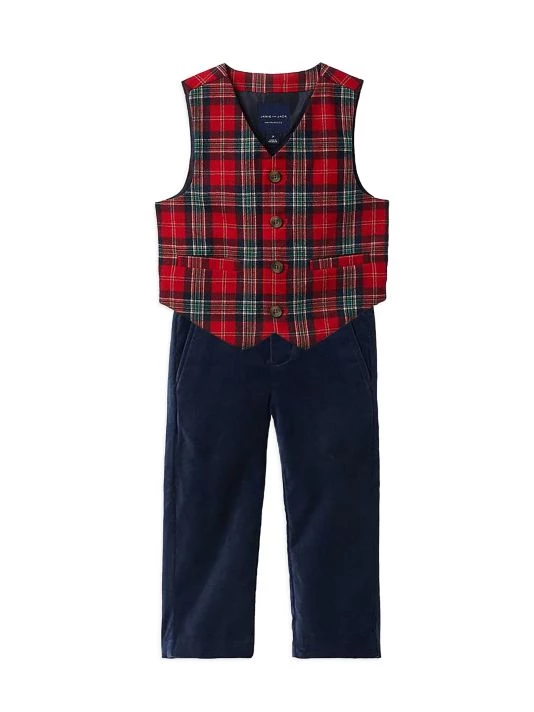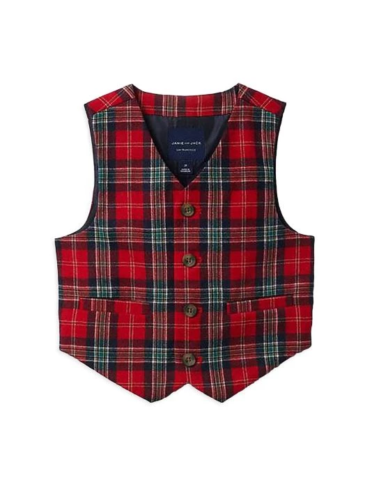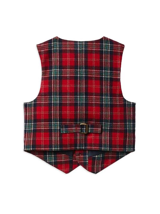 A Christmas-ready suit vest in a holdiay-inspired tartan plaid detailed with a buckle at the back and welt pockets.