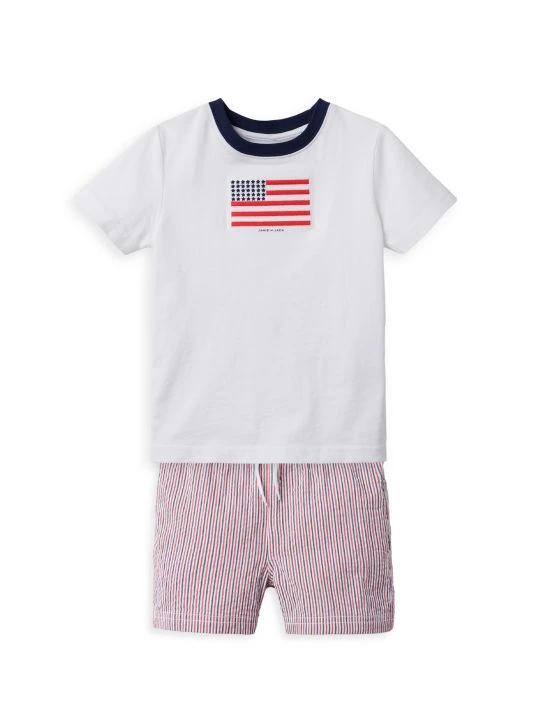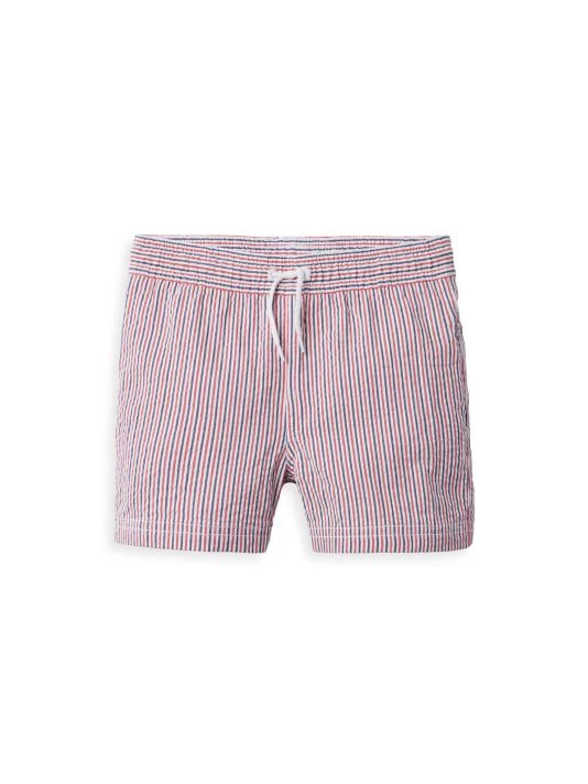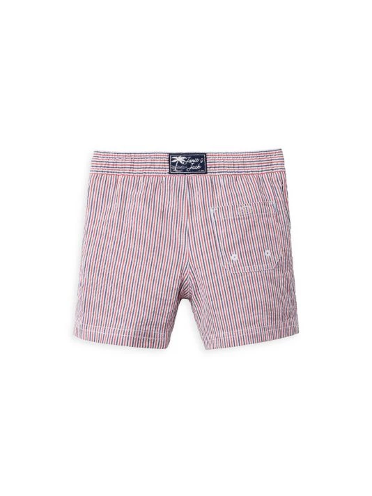 These swim trunks in a seersucker finish feature a patriotic-inspired striped pattern.