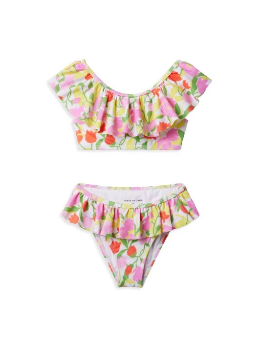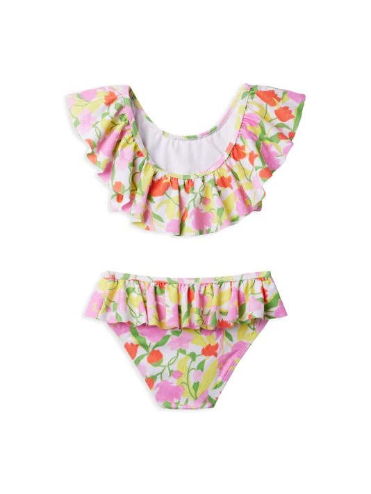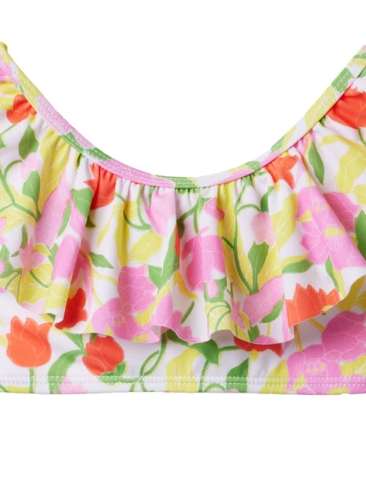This two-piece swimsuit in a UPF 50+ sun protection fabric includes a ruffle trim top and bottoms in a vibrant floral print. 82% nylon/18% spandex. Lining: 100% polyester. Hand wash. Imported.