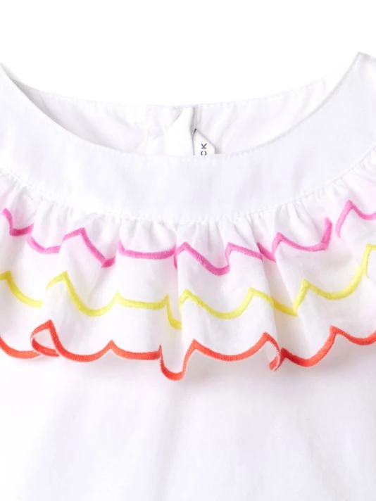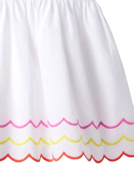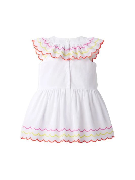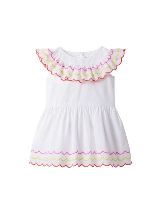 Multicolored trim at the bib collar and hem add pops of color to this casual cotton dress.