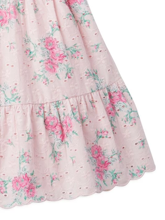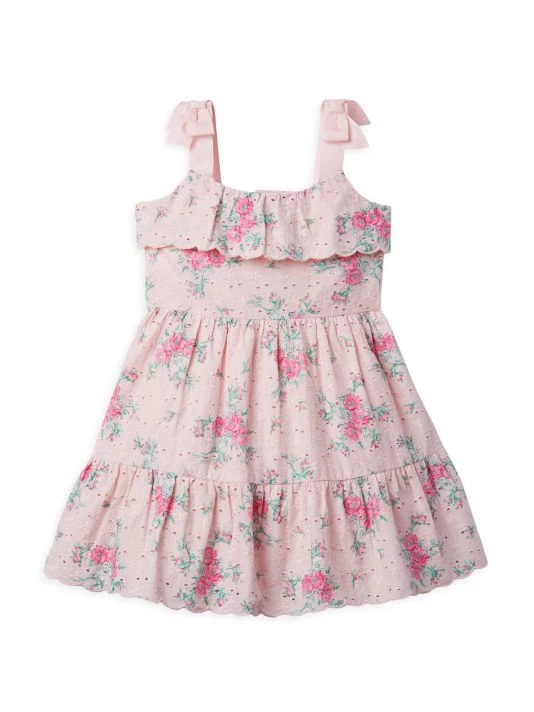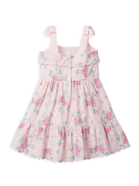 This sleeveless dress in an eyelet finish is adorned with a floral print and ribbon accents at the straps.