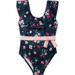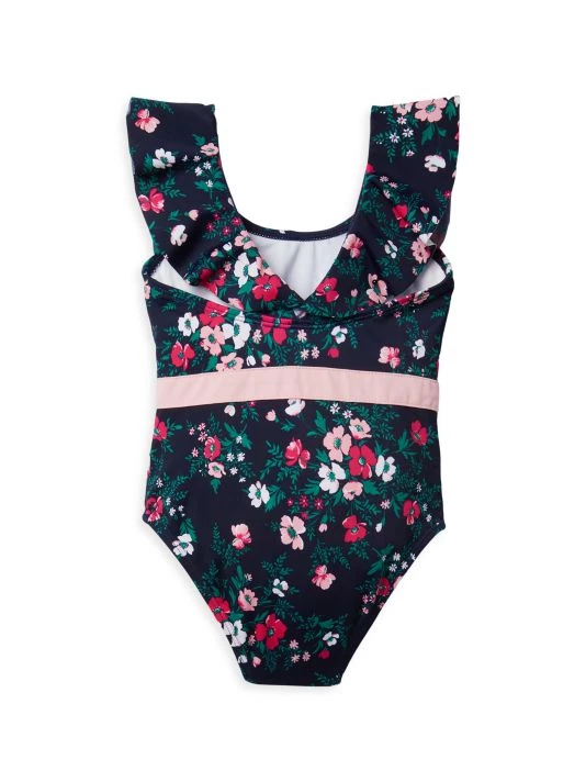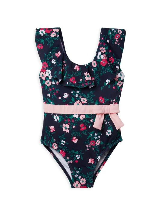 This floral-print one-piece swimsuit in a UPF 50+ sun protection fabric features ruffle details and a bow at the waist.