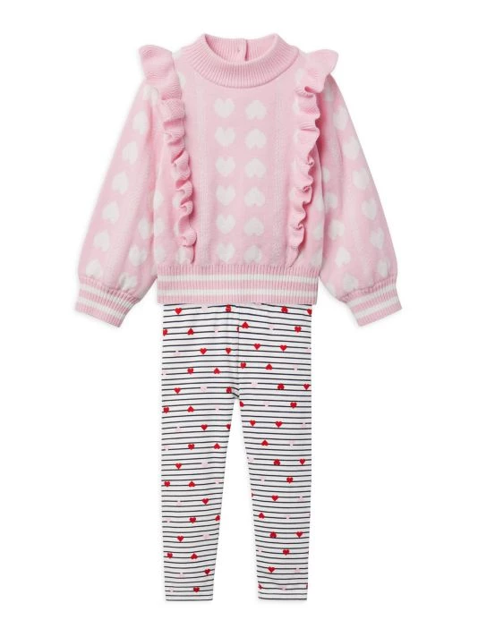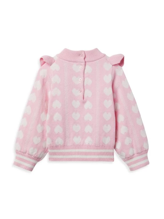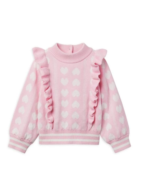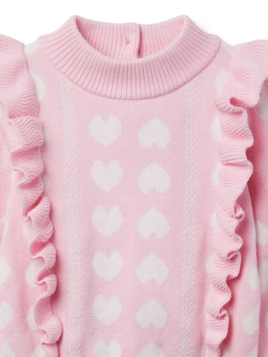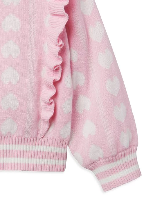 This soft sweater features all over heart intarsia, ruffle details, and striped cuffs and hem.