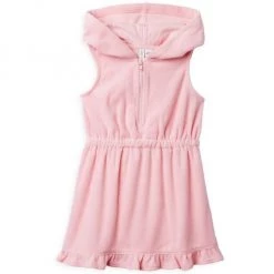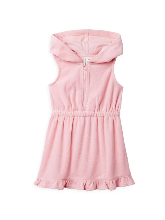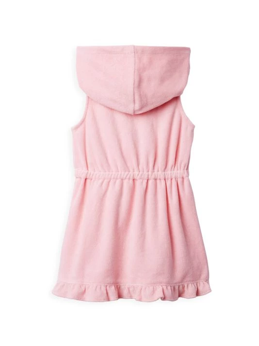 This soft terry cover-up dress in a hooded style features a ruffle hem and zip front.