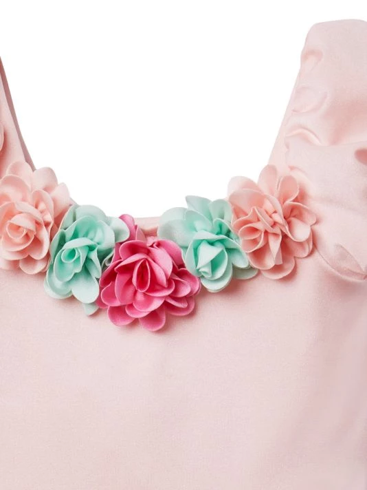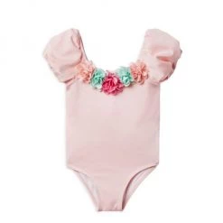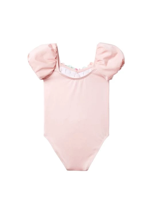 This one-piece swimsuit in a UPF 50+ sun protection fabric features floral appliques at the neckline and puff sleeves.