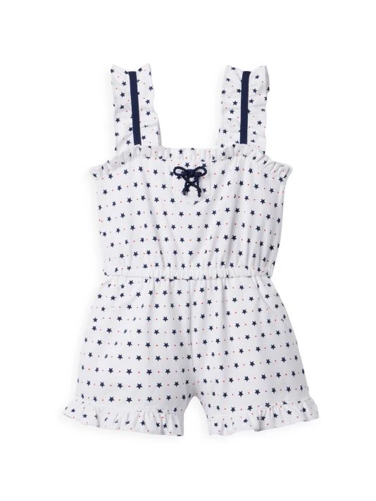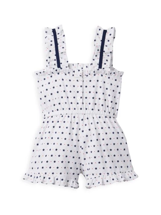 This star-spangled romper is detailed with ruffle trim, grosgrain straps, and a lace-up cord detail in the front.
