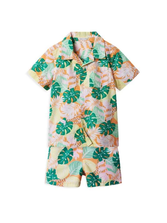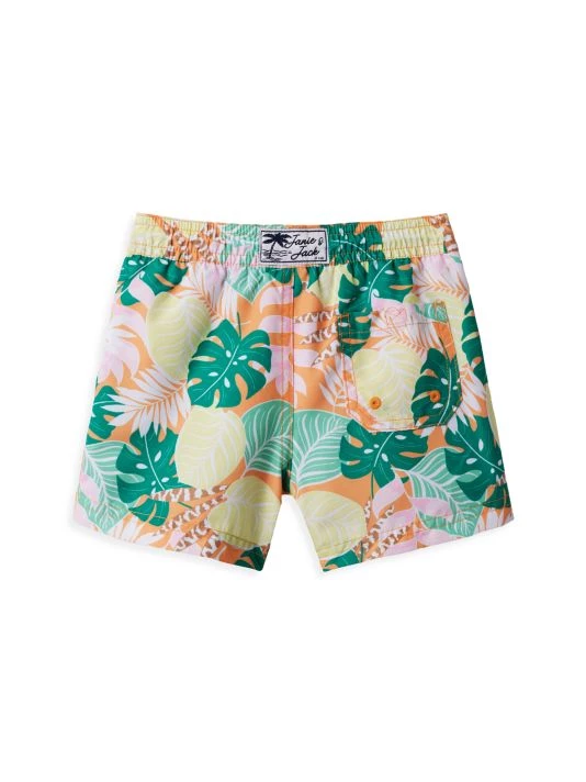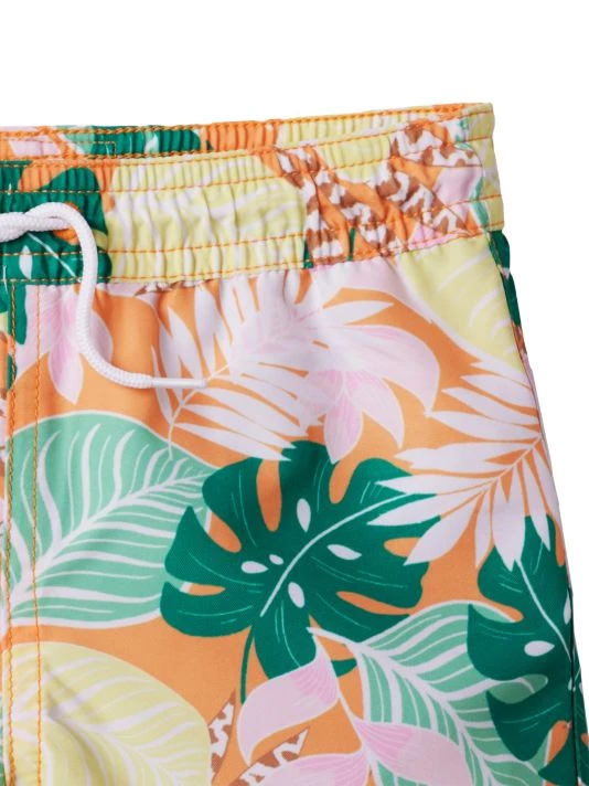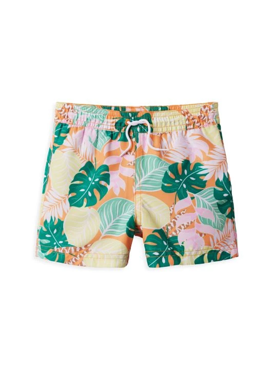 Crafted of polyester twill, these drawstring swim trunks are adorned with a vibrant tropical pattern.