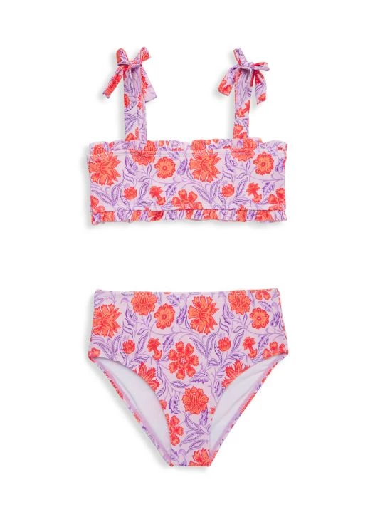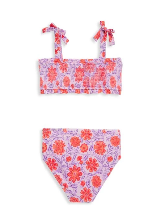 A swim look that’s blooming with style, this two-piece swimsuit in a UPF 50+ protection fabric features a smocked back detailing, ruffle trim, allover florals, and bow straps. 82% nylon/18% spandex. Lining: 100% polyester. Hand wash. Imported.