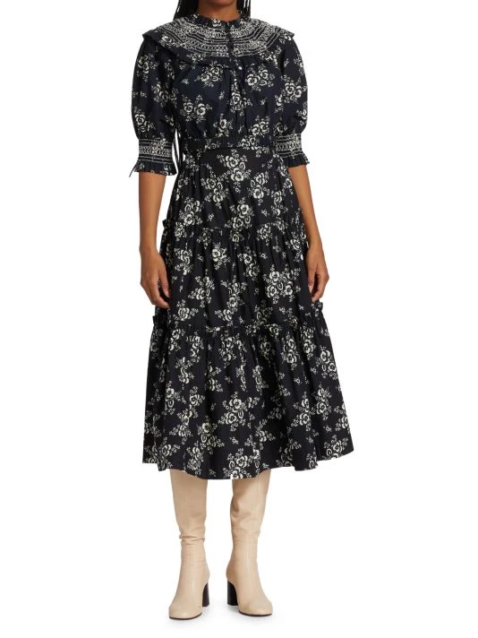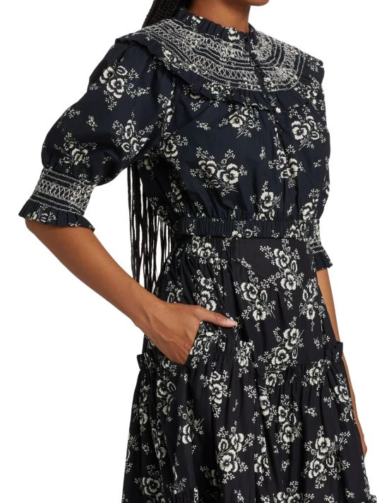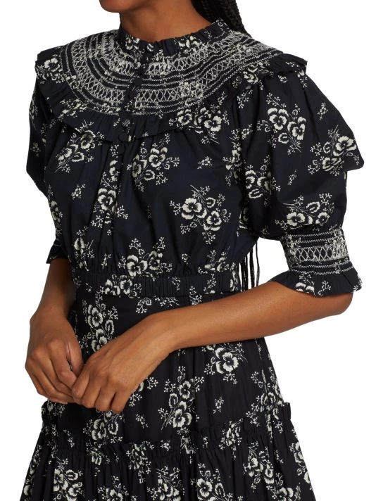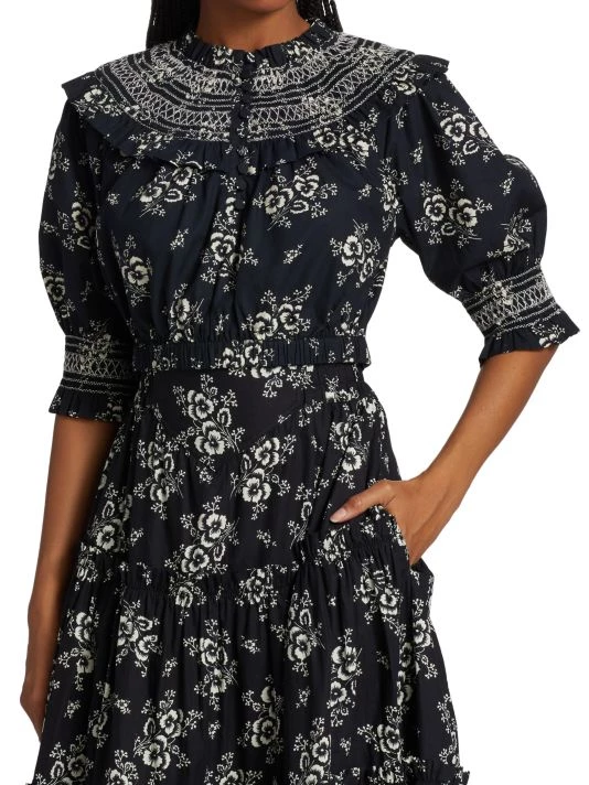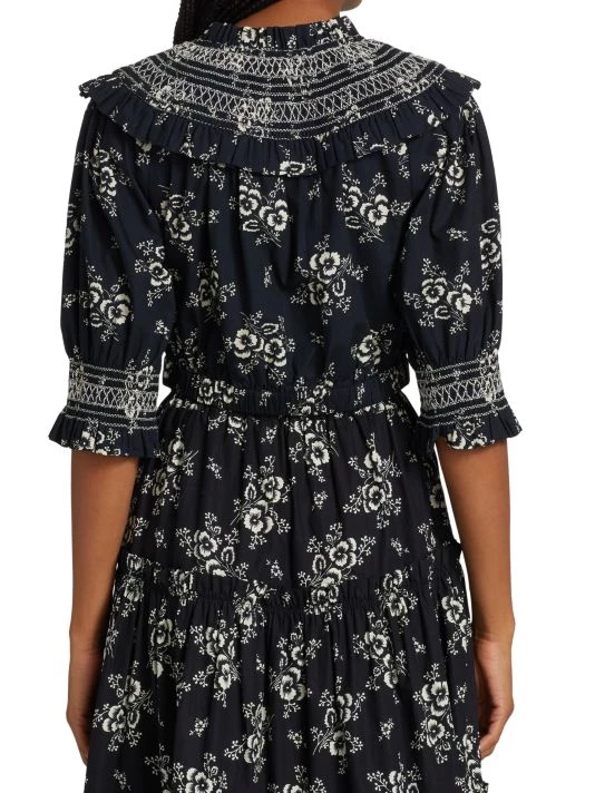 - Three-quarter puff sleeves with smocked ruffle cuffs