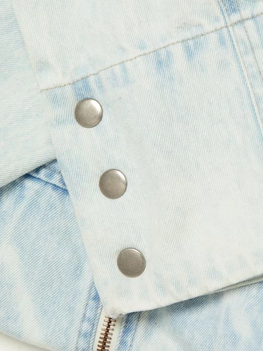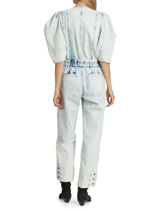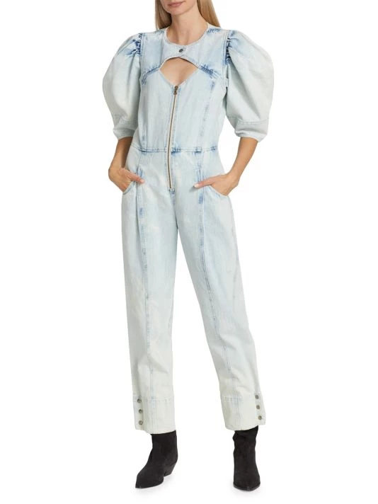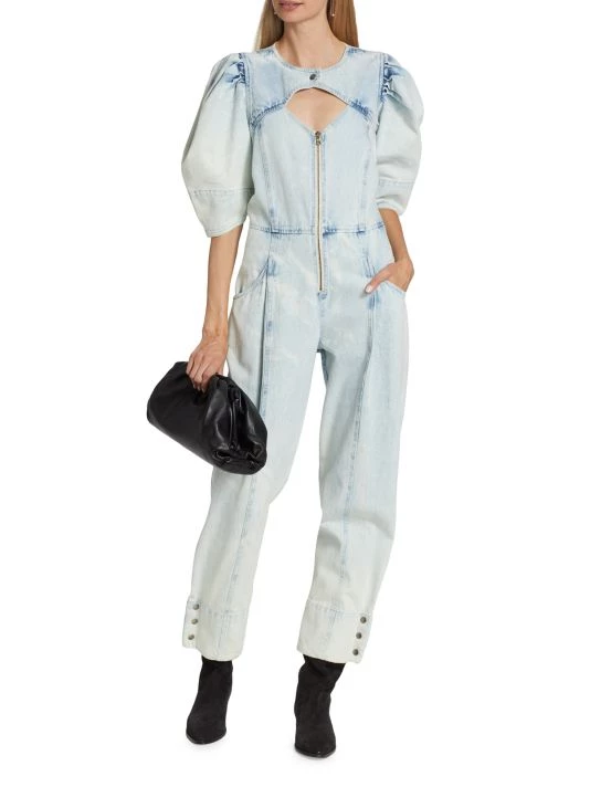 Designed with an `80s-inspired look, this bleached denim jumpsuit features bold puff sleeves and cut-out shaping.