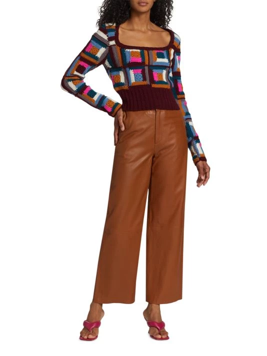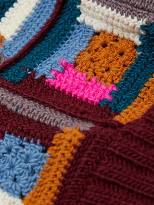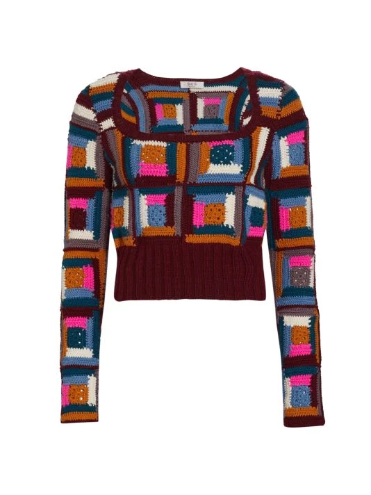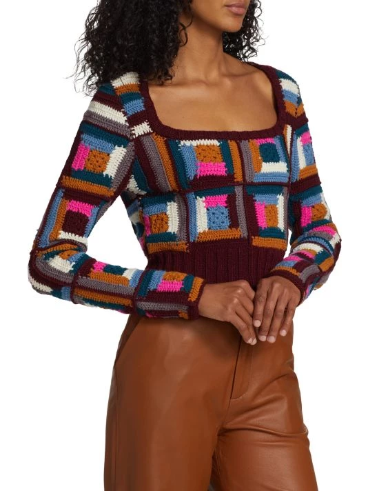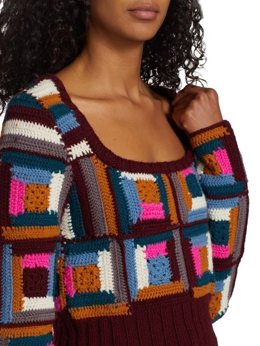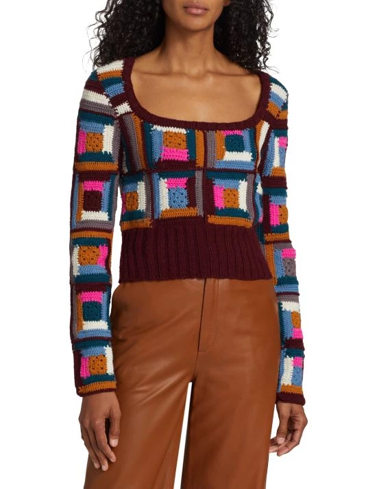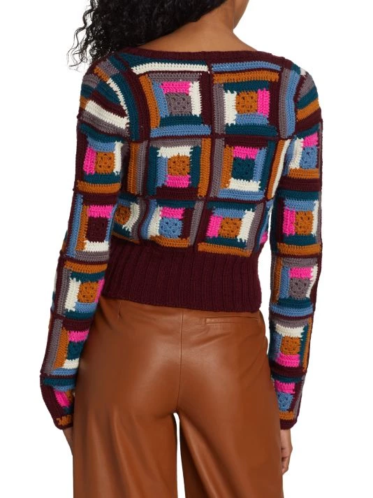 Crafted from vibrant crocheted squares, Sea’s Camryn sweater is crafted from soft wool.
