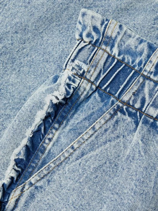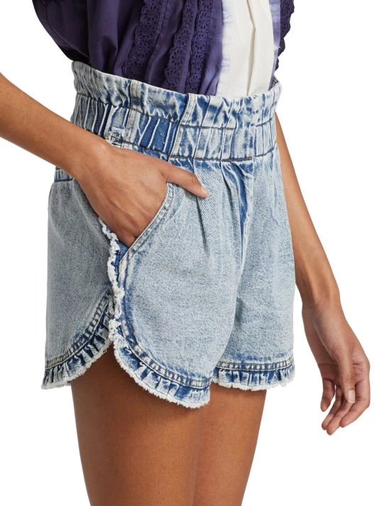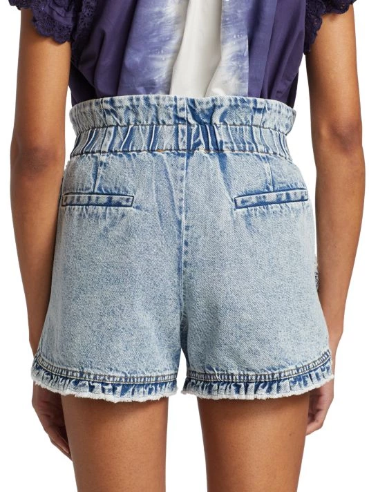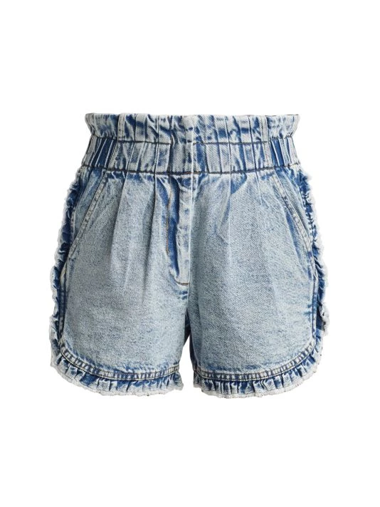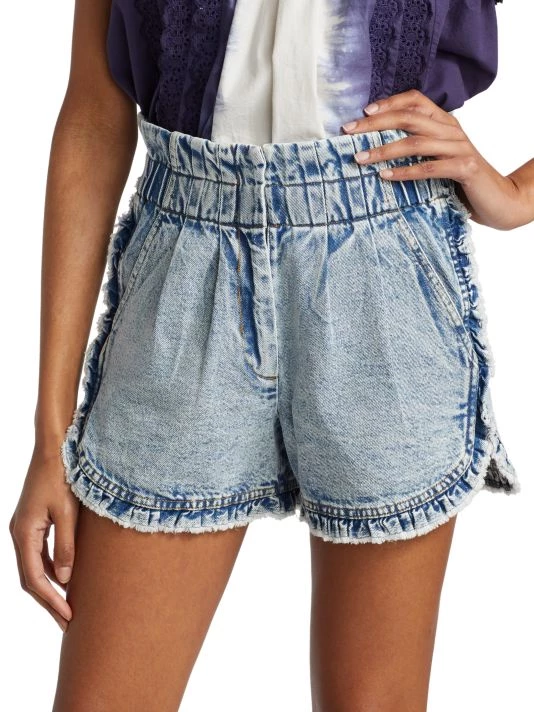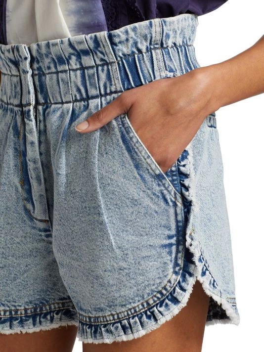 Faded in finish, these denim shorts are elevated with dainty ruffles.