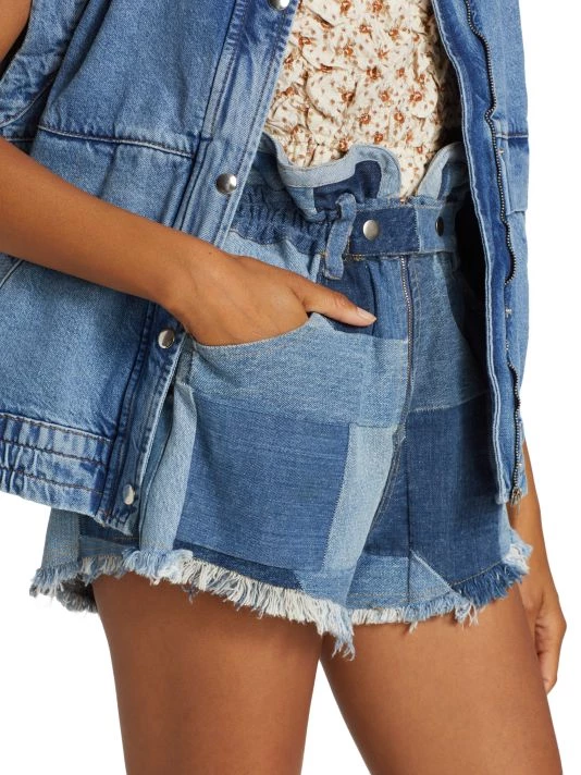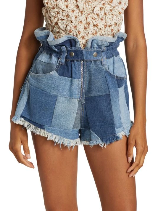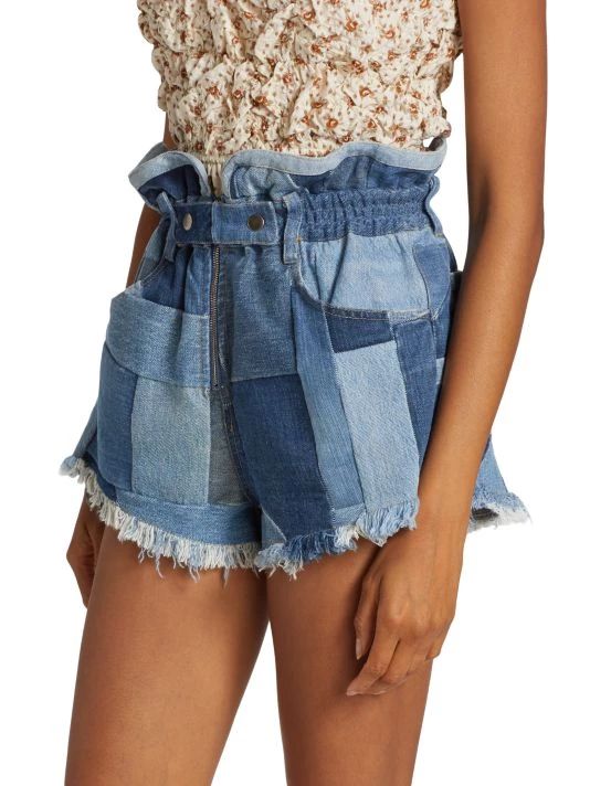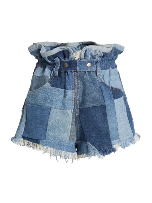 The Diego denim shorts from Sea feature bold patchwork construction and a high, paperbag waist. An exposed zip fly and raw-edge hems add an edge to the look.