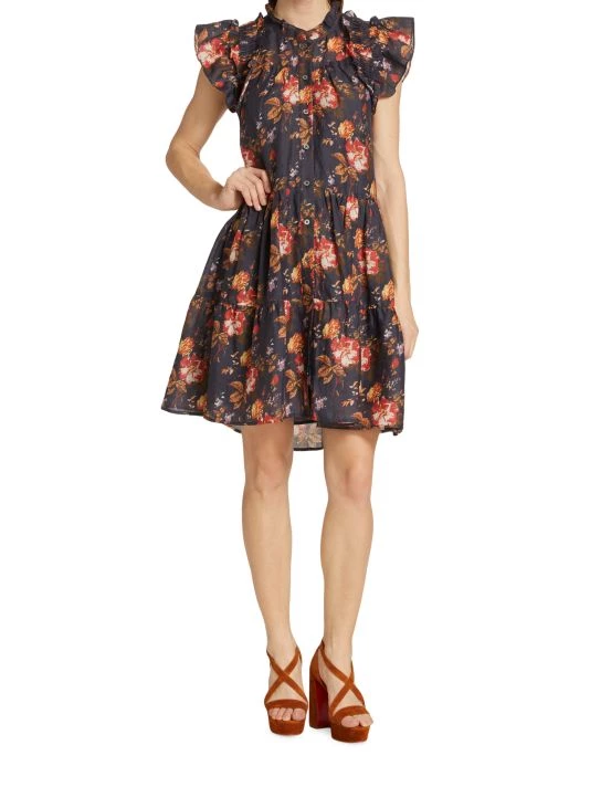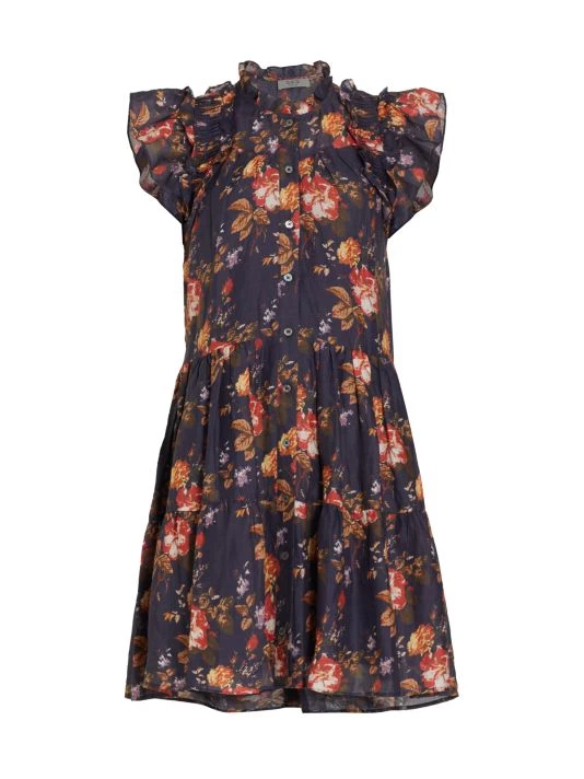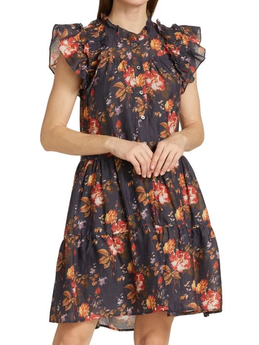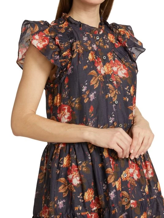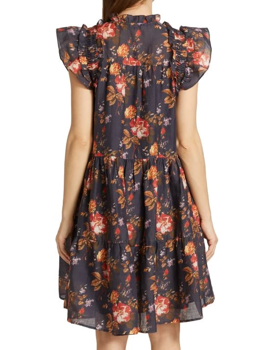 The Esme dress by Sea is made of floral-printed fabric with flared sleeves and a tiered skirt.
