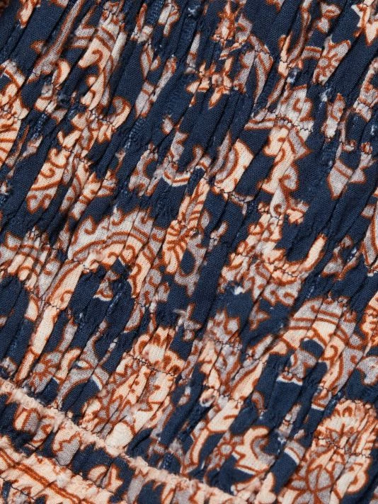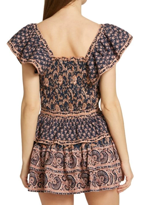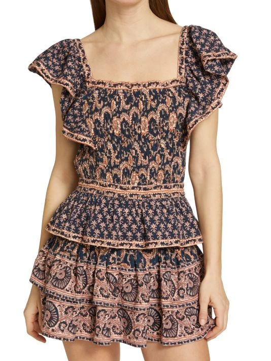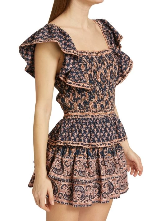 The Jasper top is crafted of printed cotton with a smocked bodice and flared ruffle sleeves.