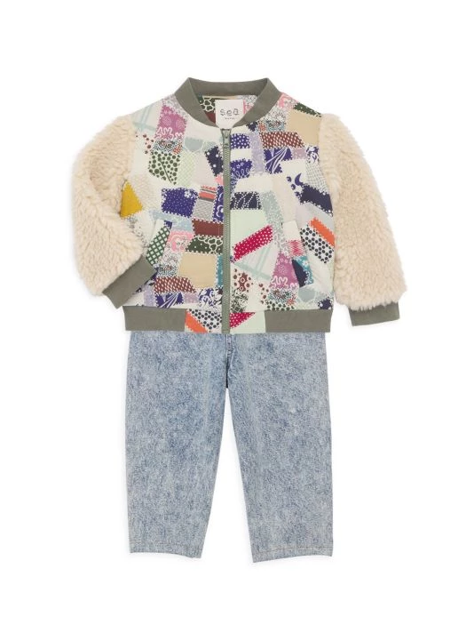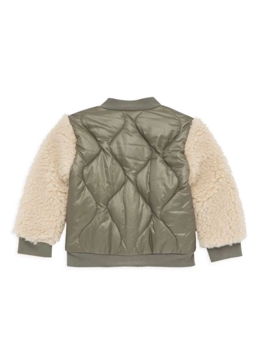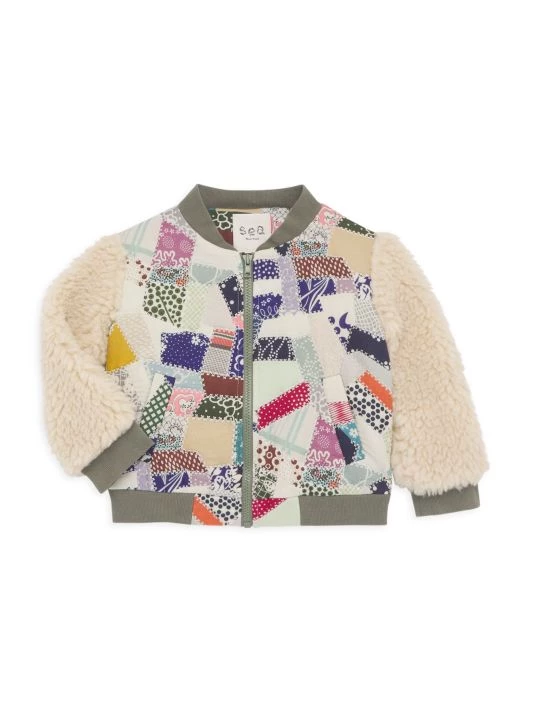 This bomber jacket is multicolor patchwork print features fleece sleeves with ribbed neckline and cuffs.