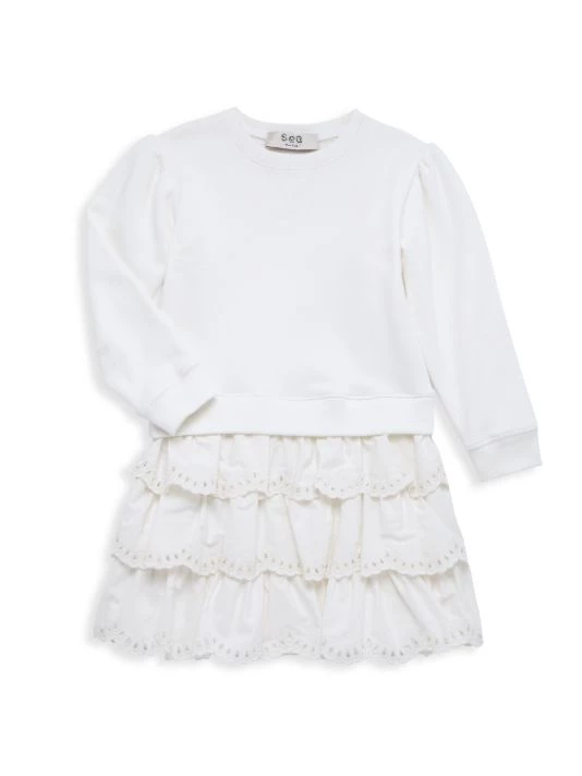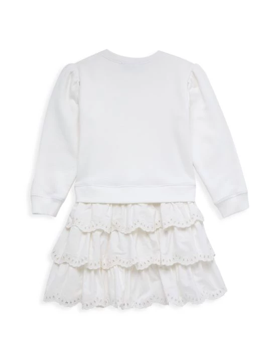 This soft dress features a sweatshirt-style top and a tiered eyelet skirt.