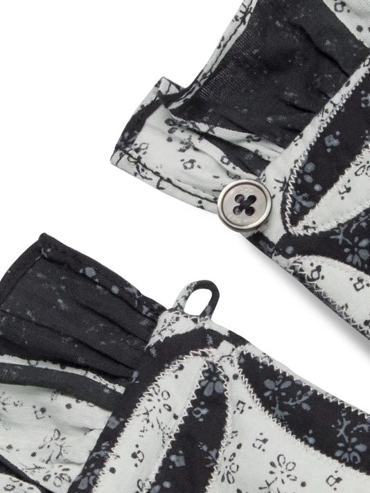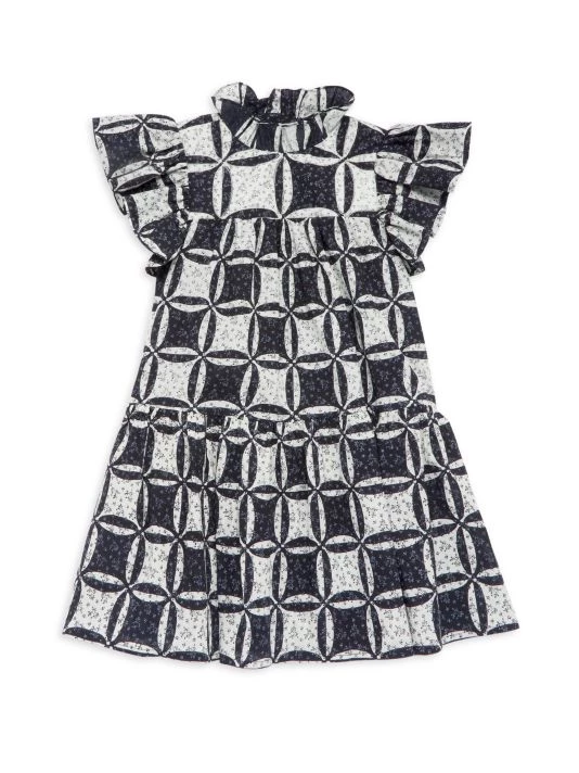 This A-line dress in a drop-waist silhouette showcases a foliage-inspired patchwork design and a ruffle neckline.