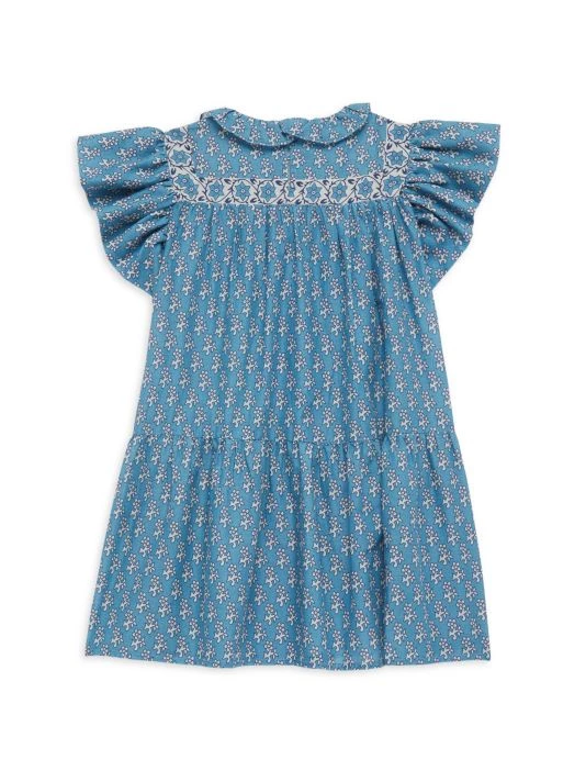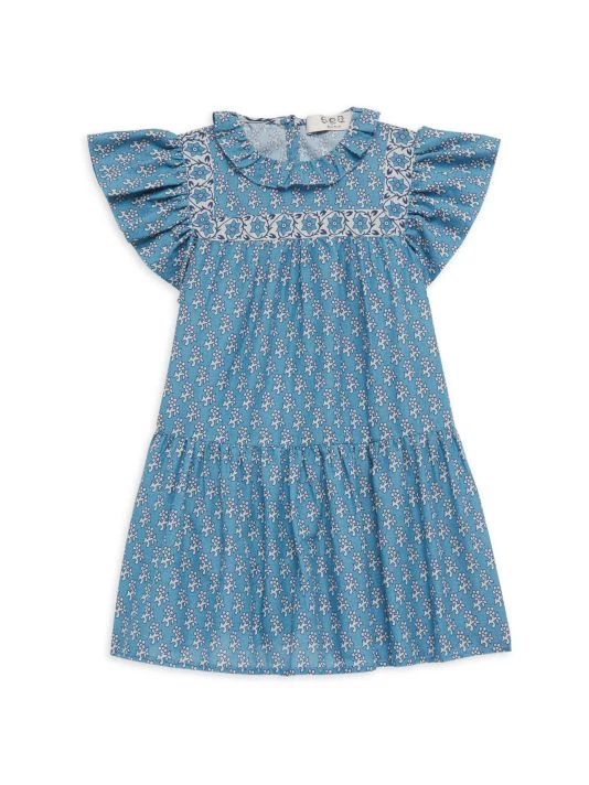 This floral-tile smocked dress features a tiered skirt and is finished with ruffles on the sleeves and neckline.