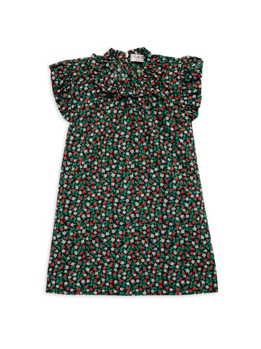 This smocked dress features a strawberry lily print enhanced with ruffles on the sleeves and along the neckline.