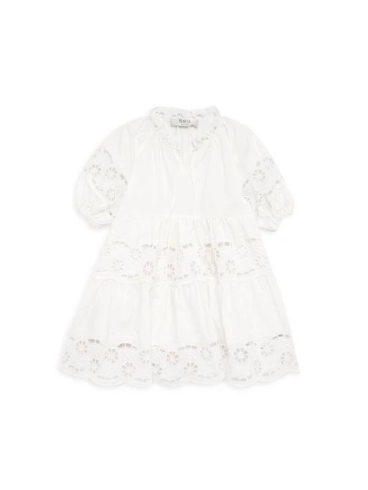 An A-line dress is detailed with eyelet trim, puff sleeves, and a tiered skirt.