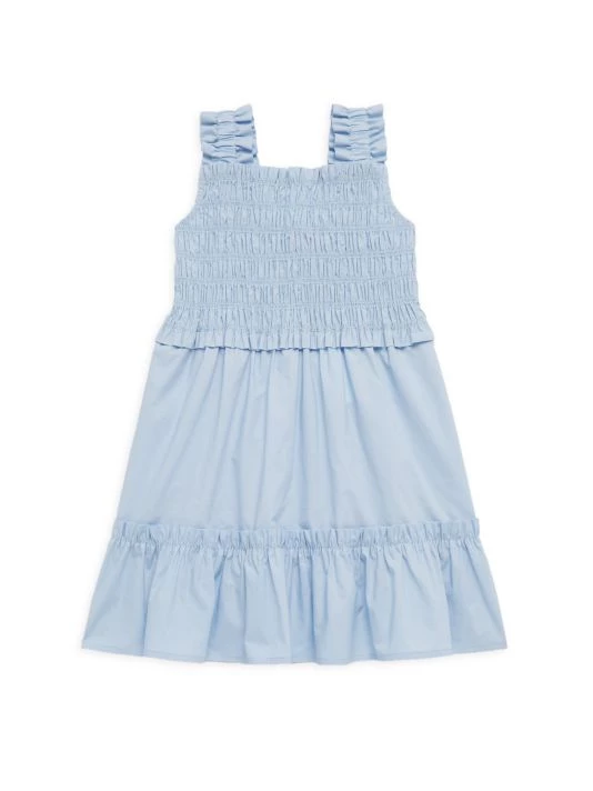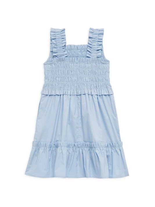 This sleeveless squareneck dress features ruffle trim at the shoulders and a smocked yoke bodice.
