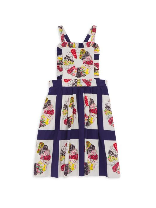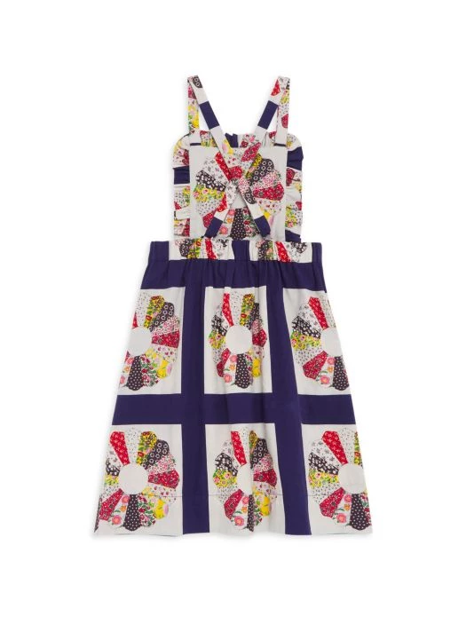 This sleeveless apron-style dress is adorned with a patchwork print.