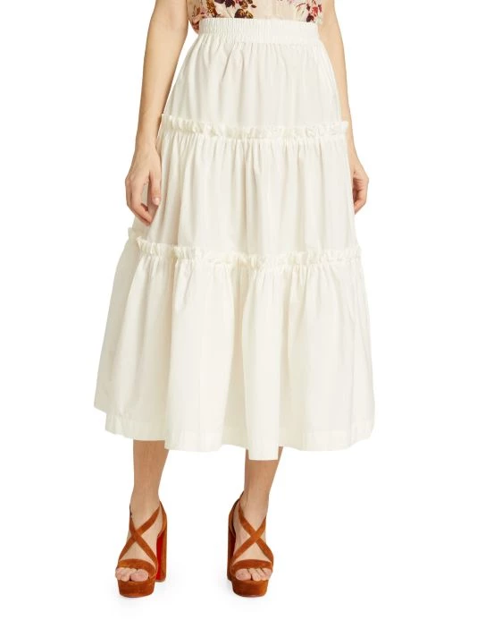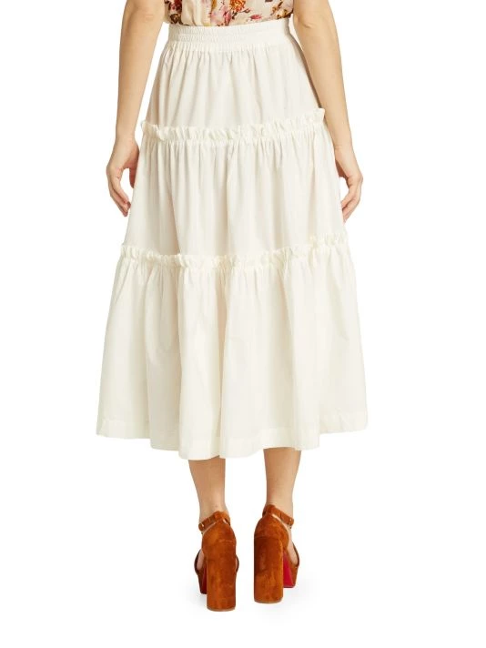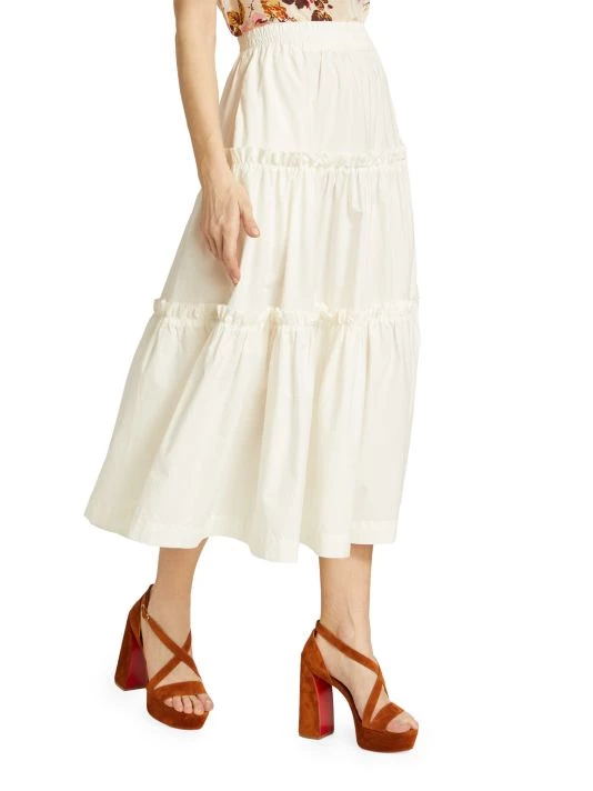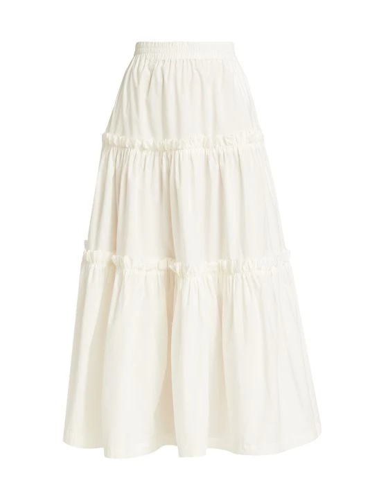 The Sloane skirt from Sea is crafted in a tiered style of a cotton blend. It features a high-smocked waistband, delicate ruffle detail, and side-seam pockets.