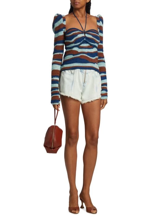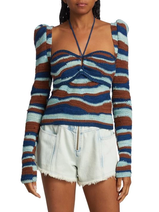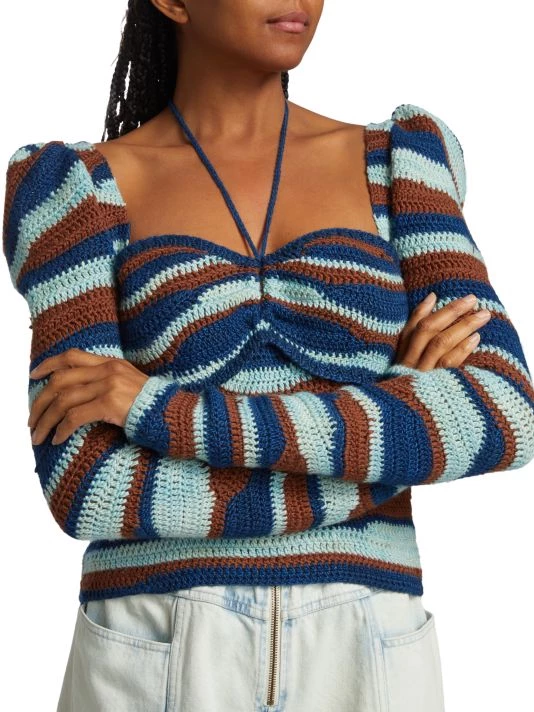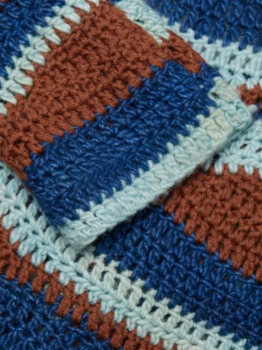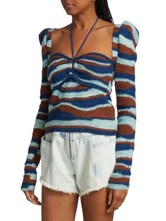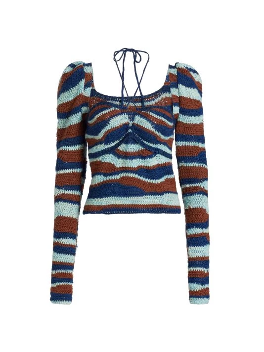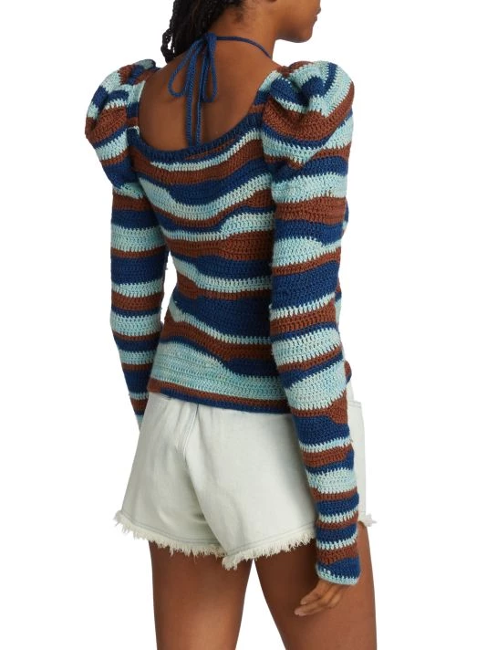 Crafted of wool crochet, the Wavey sweater by New York-based label Sea is finished with a tie-neck and colorful wave design.